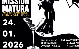 Ein Abend, um unvergessliche Erinnerungen zu schaffen, war der Maturaball des BORG Scheibbs. Unter dem Motto „Mission: Matura“ verwandelte sich die Messehalle 3 in Wieselburg in einen prächtigen Ballsaal. Die Gruppe „Indeed“ und verschiedene BORG-Bands sorgten für Tanzmusik und beste Stimmung. Dank einer perfekten Vorbereitung durch das BORG-Ball-Organisationsteam um Prof. Renate Riedl-Winter und Prof. Markus Pfneisl konnten die Festgäste eine zauberhafte Ballnacht genießen. Mehrere Bars und eine Disco, Fotobox, Schätzspiel und viele weitere Attraktionen boten Abwechslung.